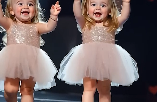 They wore soft pink tutu dresses, shimmering with sequins that seemed to dance with them. Ribbons adorned their curls, and tiny white shoes padded across the stage with uncontainable energy. The moment they appeared, the audience gasped—then melted.