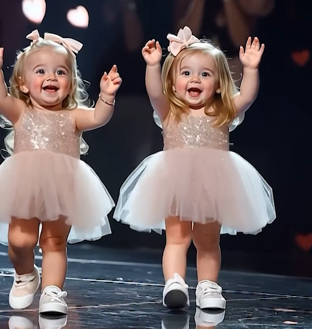 Twin toddlers, barely able to keep their balance from giggling so hard, waved their hands with excitement, looking out into the bright, unfamiliar sea of lights and faces. One of them raised her hands triumphantly like she’d just won the Olympics. The other did the same, copying her sister—only to bump into her, laugh, and try again.